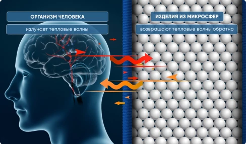Данная смесь отражает 100% инфракрасного тепла человека. При контакте с изделием, тепловые волны, излучаемые человеком, отражаются и возвращаются обратно в тело человека, и таким образом происходит процесс физиотерапевтического лечения собственным теплом.